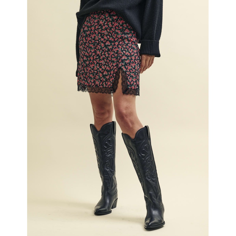 We cant get enough of the micro mini. Trimmed with lace, this vintage black design is contrasted by striking red poppies. Were obsessed with the leg-lengthening side slit. Style yours with stompy boots this winter.Concealed zip fasteningSide slit