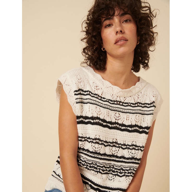 Ready for summer. Coming in classic black and white, our vest is designed with delicate crochet details. Were obsessed with the scalloped edging. Lightweight, its the perfect piece for layering or wearing solo: weve styled ours with jeans.Boat neckSleevele
