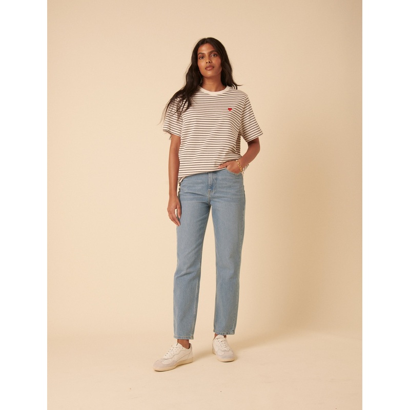 Black And White Striped Heart Embroidered T-Shirt