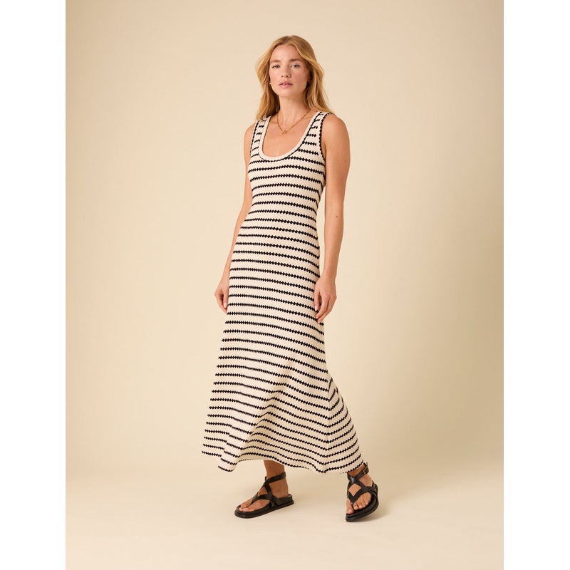 Minimal effort, maximum impact. This black and white textured maxi dress balances a fitted bodice with a flowing skirt, keeping things structured yet effortless. Just add sandals. Scoop neck Sleeveless Designed to be semi-fitted