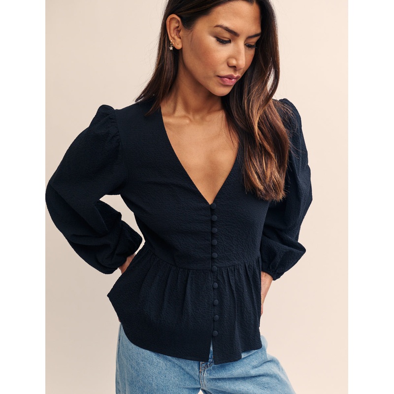 The perfect black blouse. Puff sleeves and a delicate row of buttons add to the look. Style yours with mid wash denim.V-neckLong puff sleevesButtonsPeplum hem designed to flatter