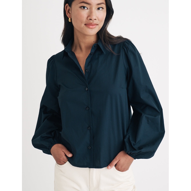 Della in black. This oversized shirt is what you need for everyday wear. Featuring the classic collar and button front, you cant go wrong. Style yours with denim of the season.CollarButton frontLong puff sleeves