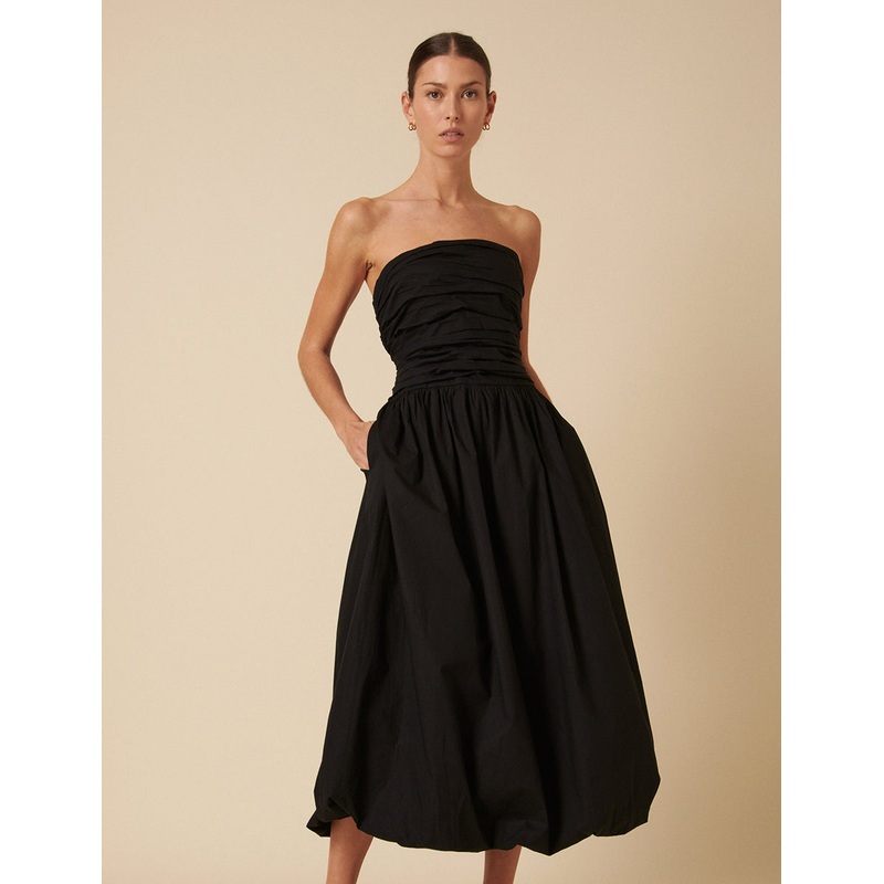 Meet Dannie. Coming in black, we love the bandeau cut with a shirred bodice. She falls to an on-trend bubble midi skirt. Just add barely-there heels or sandals.
