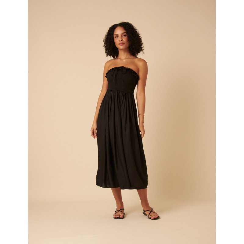 Youll wear her everywhere. In classic black, our midi dress brings all the drama with its bandeau bodice and flowing silhouette. Bandeau neck Lightly lined so the fabric falls beautifully Elasticated waist for comfort Designed to be semi-fitted Size tip: w