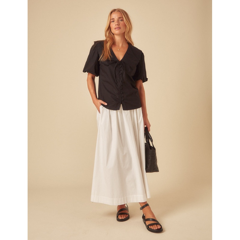 Our much-loved Birdie blouse is back with short puff sleeves. Dont miss the delicate scallop trim, string tie detailing and fabric covered buttons, shell go with everything you already own in classic black. Just add denim.