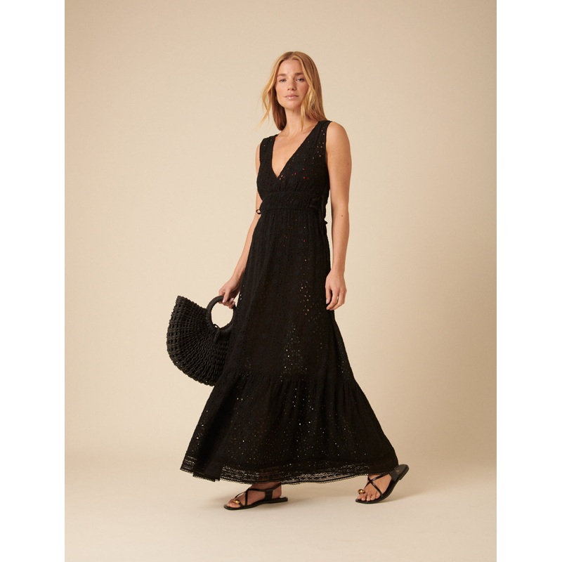 Make it maxi. This black broderie dress is the one to float through summer in, with a V-neck, tie waist, and breezy silhouette. V-neck Tie fastening Designed for a relaxed fit Size tip: we recommend your usual size