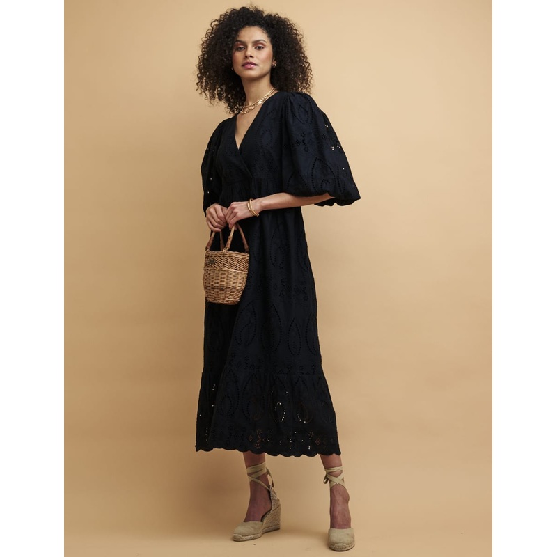 Check into NC Boutique: a resort-inspired collection. Intricately detailed with broderie anglaise, its the tonal stitching that sets this classic black smock dress apart. Stroll down to the marina in summer-ready espadrilles and let the scalloped, tiered h
