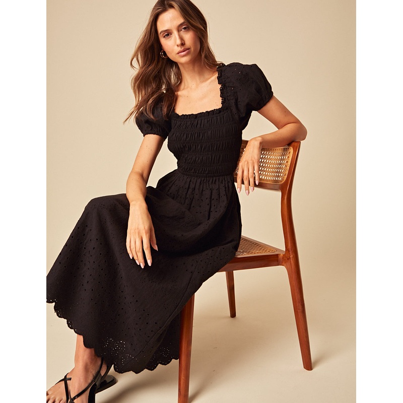 Sundress season starts here. This black broderie midi is all about the details, from the scalloped hem to the perfectly fitted shirred bodice. Just slip on sandals. Square neckShort puff sleevesElasticated waist for comfortSize tip: we recommend your usual