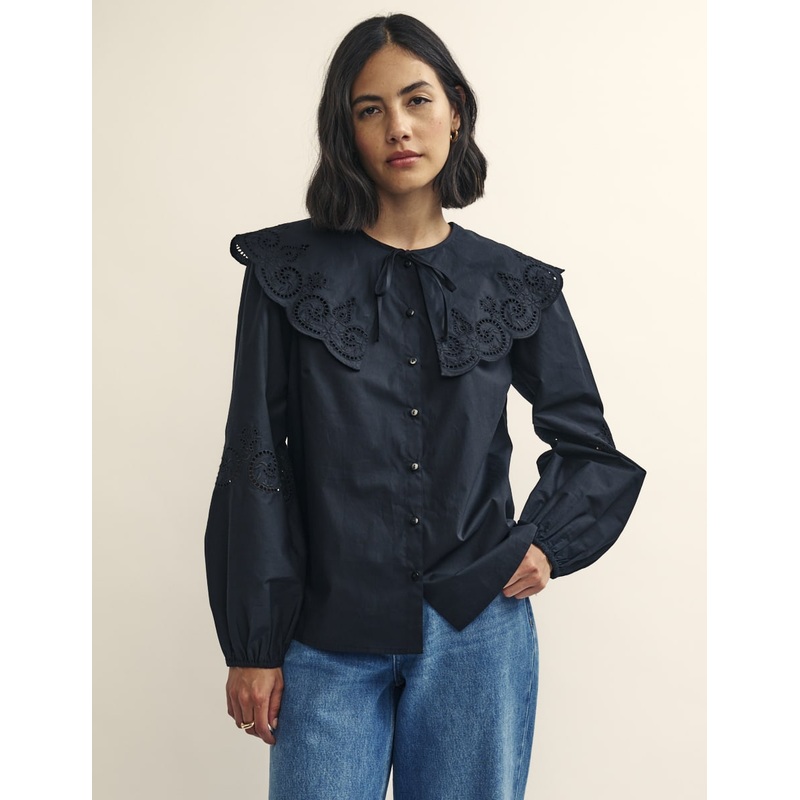 Scalloped, embroidered and finished with a bow we think we just made your favourite new shirt. This black number is both light and breezy. We love the ultra-voluminous sleeves. Style yours with mid-wash denim. Oversized collar Long balloon sleeves Button f