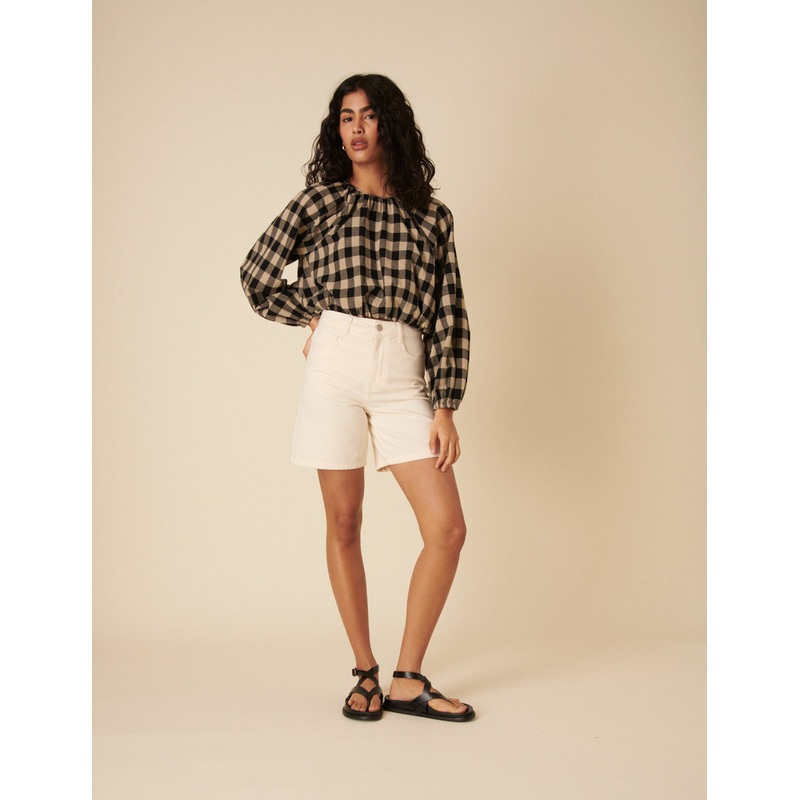Marlice is a must-have. Coming in a classic black and beige gingham print, our blouse features billowy sleeves and a relaxed silhouette. We love the elasticated detail at the hem and cuffs for added volume. Style with your favourite NC jeans.
