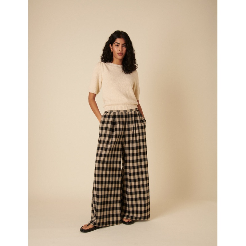 A new take on tailoring. Designed to flatter, our classic black gingham pleated pair nips in at the waist and falls effortlessly to a relaxed wide leg. Wear yours with a beige knit. Wide leg cut Side pockets Elasticated back