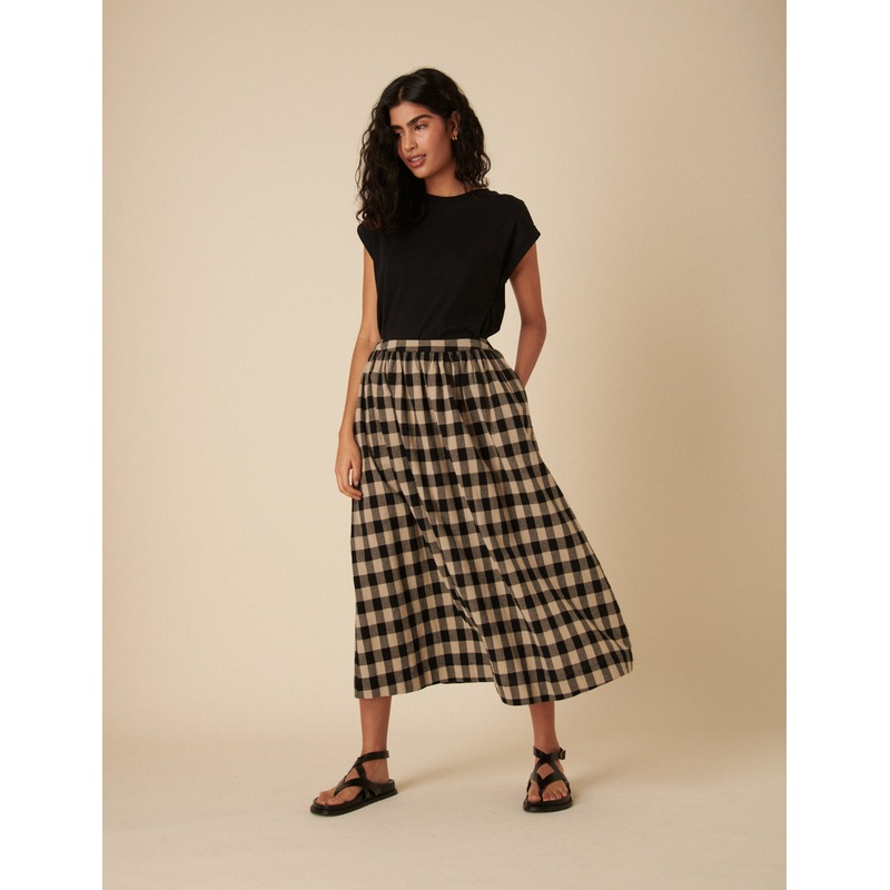 Meet your new midi skirt. Coming in a classic beige and black check, our skirt is all about swishy movement. Style with a black or white tee for a casual look.A-line skirt that skims the bodySize tip: we recommend your usual size