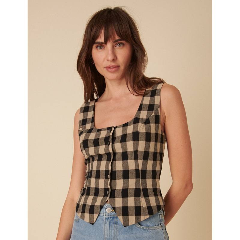 Outfit check. Coming in black and beige gingham, we love the fitted silhouette and artful button front on our Celeste top. Perfect for wearing solo on warm days, simply style with your favourite NC denim. Scoop neckline Sleeveless Button front