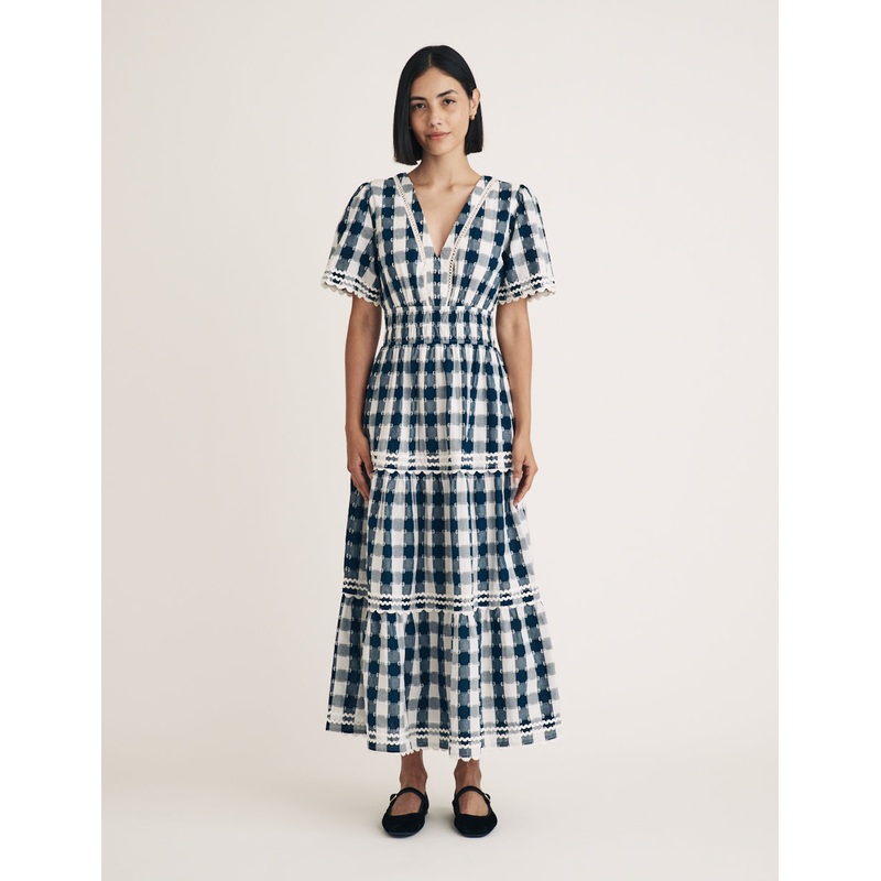 Another one for the gingham girls. We love her decorative details, flattering shirred waist and swishy tiered skirt. Wear yours with Mary Janes and gold accents.V-neckShort sleevesShirred waist designed to flatterRelaxed tiered skirt that skims the body