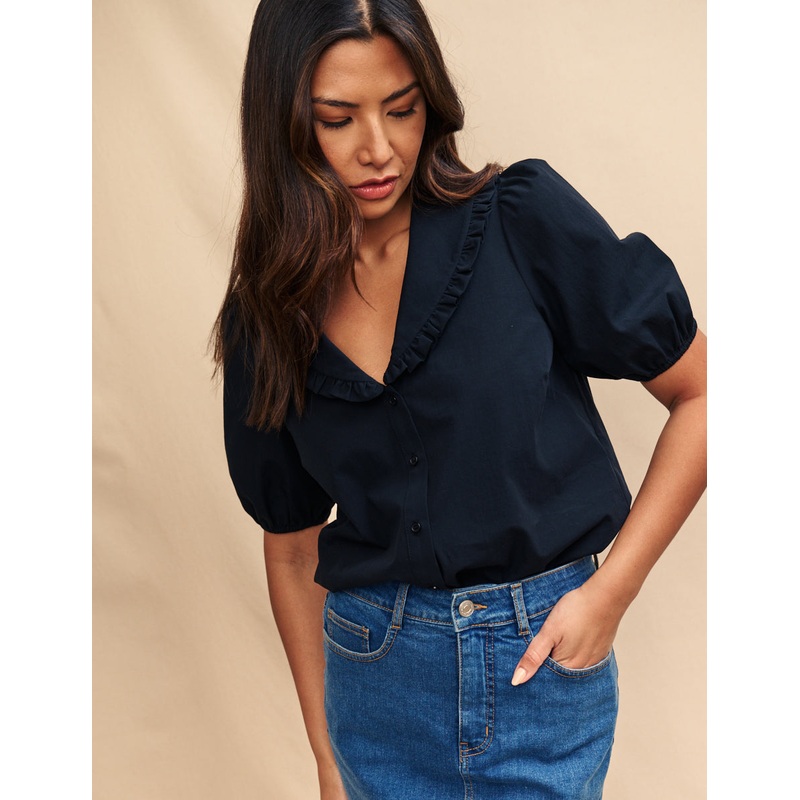 Were obsessed with an oversized collar. Trimmed with a flouncy ruffle, this classic black shirt dips into a v-neckline. We also love the puff sleeves. Style yours with jeans and gold accents. Drop collar Mid-length puff sleeves Button front Boxy fit