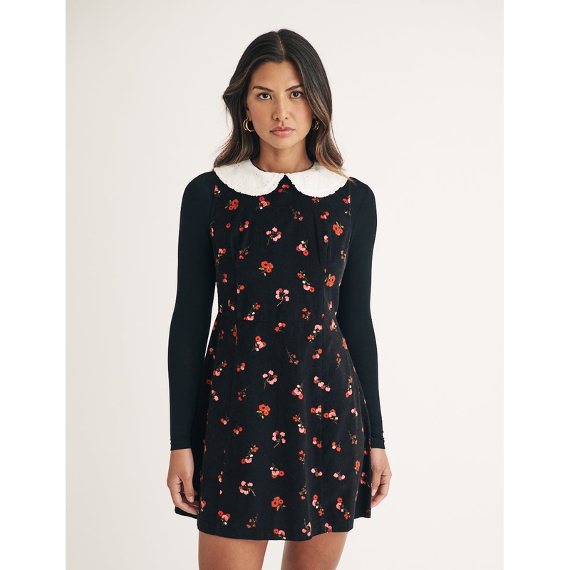 So preppy, so chic. This crew neck mini dress comes in classic black. We love her floral print, pinafore design and contrasting Peter Pan collar. Styled on her own or layered over your favourite tops, then team with boots for a so-now finish.CollarSleevele