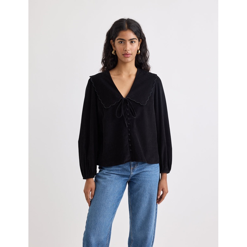 The Peter Pan collar is here to stay. This season the trend is back with a delicate scallop trim, string tie detailing and fabric covered buttons. Pair yours with your favourite denim jeans.