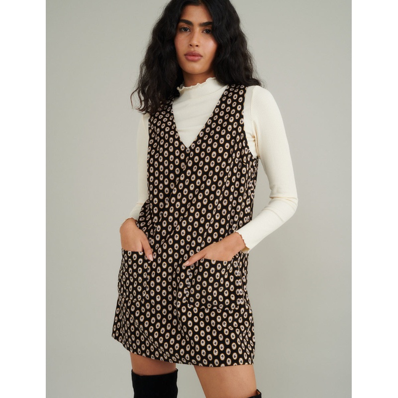 Pipers here and what cant she be worn with? This black pinny features a deep v-neckline and two pockets at the front for your everyday essentials. Pair her with a statement shirt.