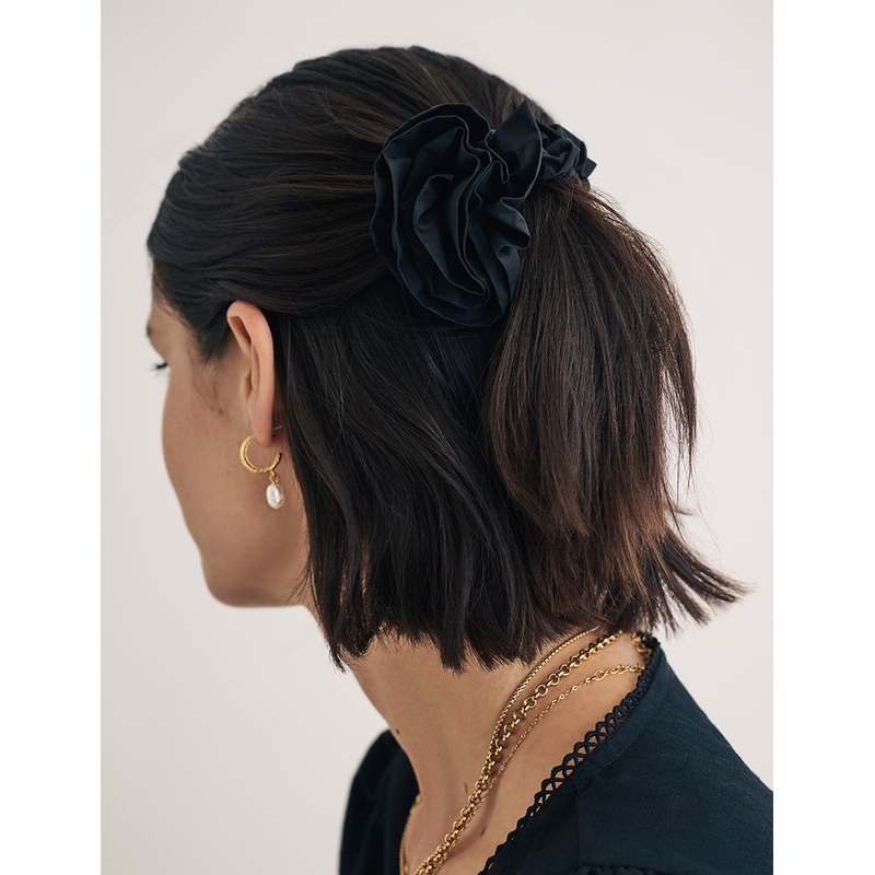 A so-now scrunchie with a floral twist. Your new favourite hair accessory comes in a classic black shade. Pop her in your hair to add an extra feminine flourish to any outfit.