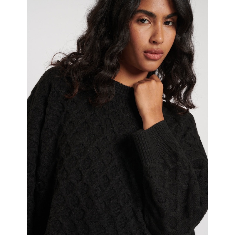 Make a cosy update to your current jumper collection. This classic black knit comes with a flattering crew neck. We love the cable knit design that continues down the long sleeves. Style with jeans and boots for a so-now look.Crew neckLong sleevesSoft ribb