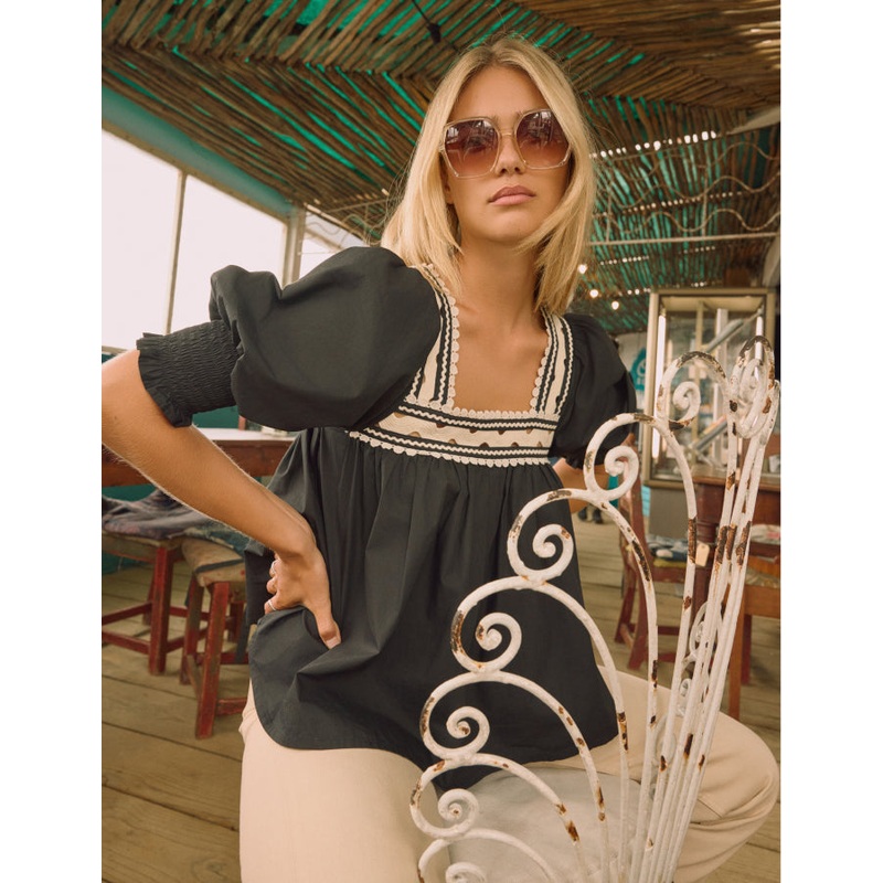 Grow your blouse collection with Gibson. Coming in classic black, we love the voluminous silhouette, intricate lace detailing and puffed sleeves. Were wearing ours with NC jeans. Square neck Long balloon sleeves Smock fit
