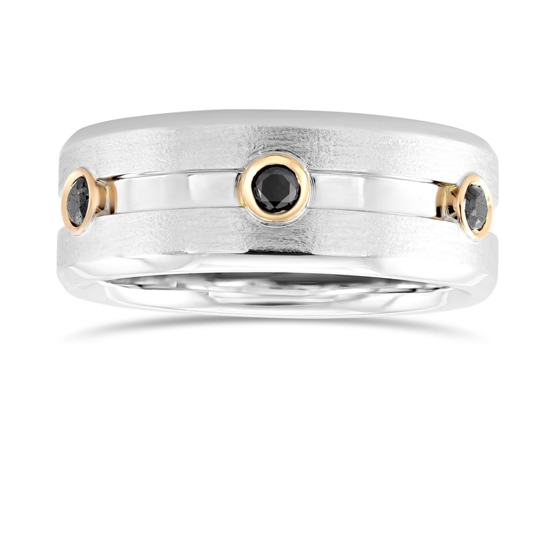 A stylish men’s black diamond wedding band featuring 6 black brilliants styled in a bezel setting and mounted in 18K brushed white and rose gold.