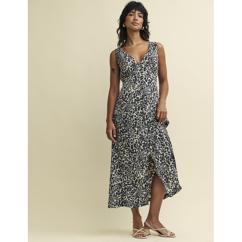 Get your frills. Clio is a monochrome floral dress with ruffle trims and a delicate line of fabric covered buttons. Elevate yours with gold jewellery.Low v-neckUnder bust seams designed to flatterButton frontRelaxed skirt that skims the body