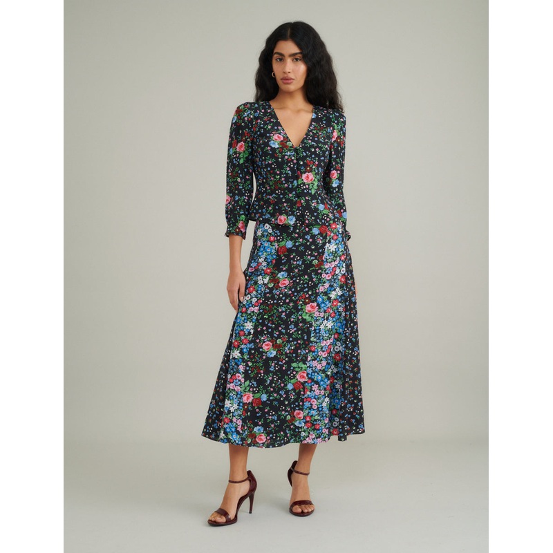 Black Ditsy Floral Midi Skirt