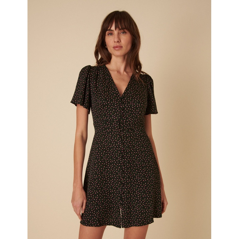 A moment for the mini. This little black number is blooming in florals. We love the V-neckline and swishy skirt that skims the body. Style with boots for a so-now look. V-neck Short sleeves Button down Relaxed skirt that skims the body Size tip: we recomme