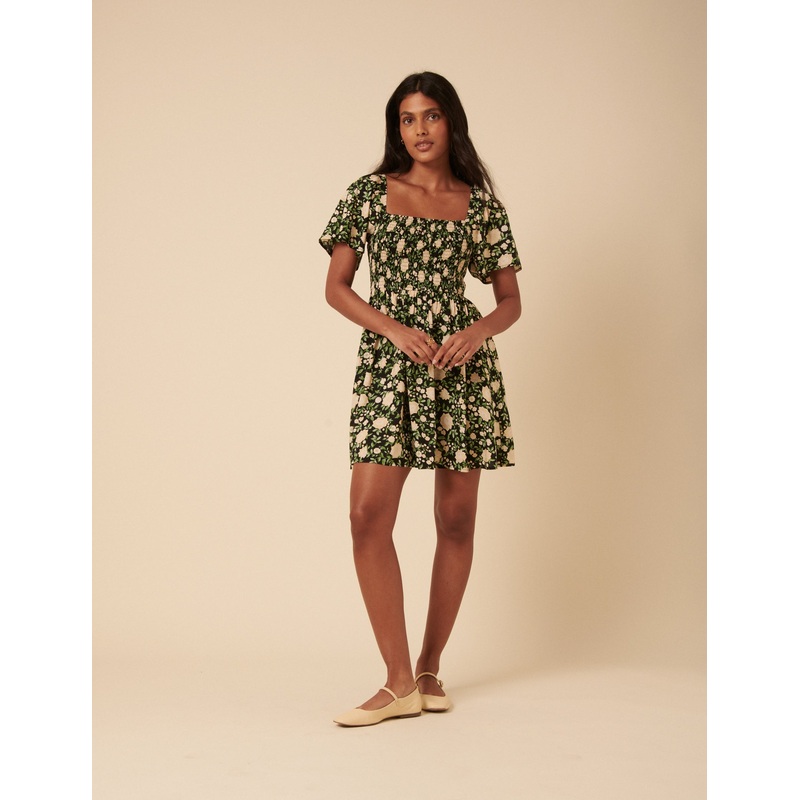 Square neck Short sleeves Shirred bodice that defines the waist Size tip: we recommend your usual size