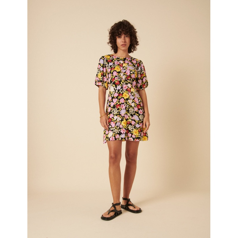 Dress her up or dial her down. This black floral print dress will take you from day to evening in an instant. We love her puff sleeves and swishy skirt. Style yours with boots and throw over a black cardigan. Round neck Mid-length puff sleeves Curved waist