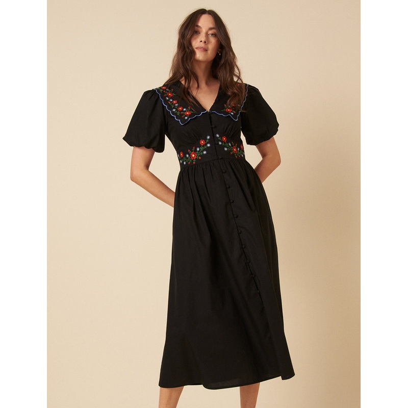 A moment for the Birdie Midi. Coming in classic black, we love the elevated embroidery along the Peter Pan collar. Shes complete with puff sleeves and a flattering fitted waist. Style with barely-there heels. V-neck Drop collar Short puff sleeves Covered b