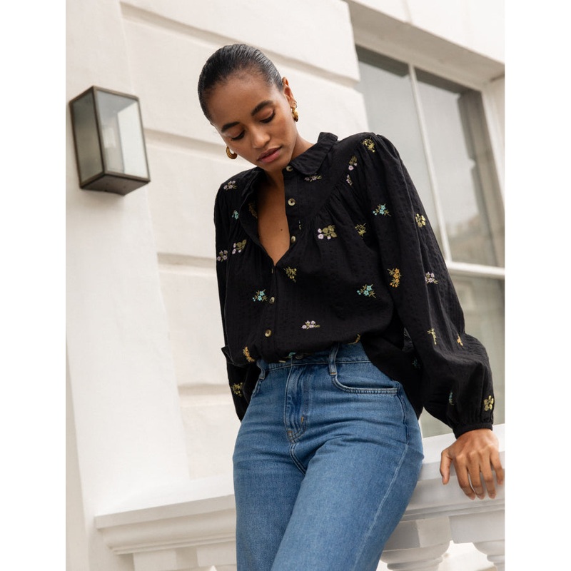 Perfect for all occasions. In classic black and decorated with pretty floral embroidery, its the blouse youll wear on repeat. Were obsessed with the billowing blouson sleeves, classic collar and the fit and flare shape. Style yours with your favourite NC jeans.