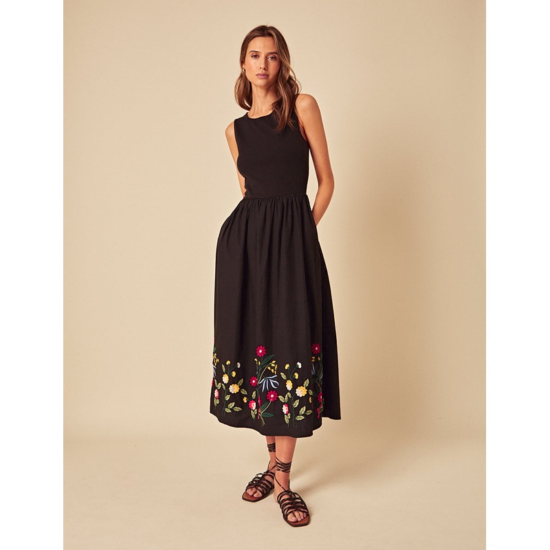 A little black dress, but make it NC. Coming in classic black, our midi dress pairs a classic silhouette with playful floral embroidery at the hem. Just add strappy sandals. Boat neck Sleeveless Designed to be semi-fitted Size tip: we recommend your usual