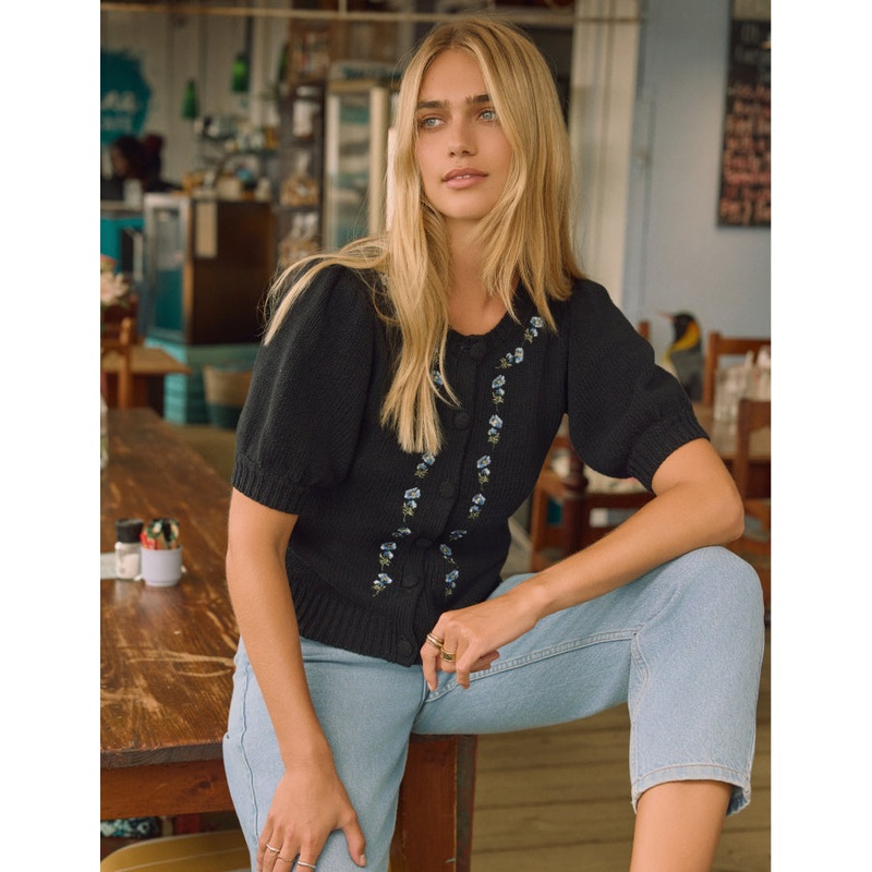 The classic cardigan, reimagined. Coming in classic black, we love the delicate floral embroidery and subtle puff sleeves. This soft-knit style is the perfect to extra layer or styled solo, buttoned up as a top. Were wearing ours with NC jeans.