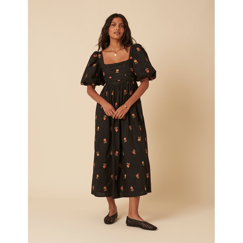 Black Floral Embroidered Nova Midi Dress