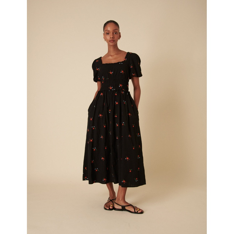 Were obsessed. Coming in black with pretty red florals, our midi dress features a square neckline and ruching at the bodice designed to flatter. She falls to a flowing A-line swishy skirt. Simply style with black sandals. Square neck Short puff sleeves Ela