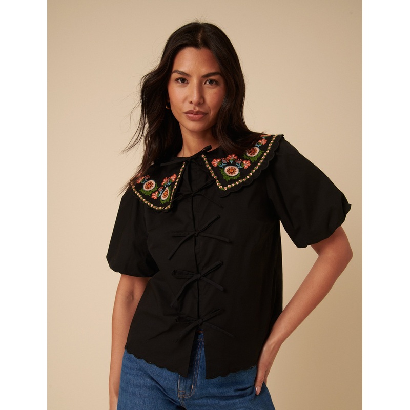 Be the first to review “Black Floral Embroidered Tie Front Blouse”