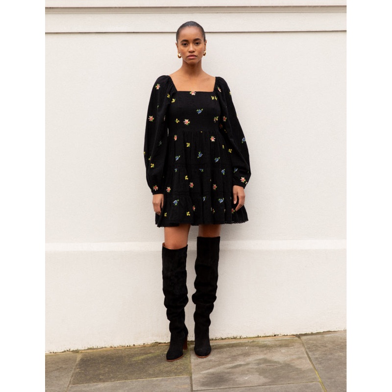 Theres lots to love about this mini dress. Coming in classic black detailed with a floral print. Were obsessed with the long puff sleeves and tiered skirt, trimmed with ladder lace. Add to basket whilst you can. Were wearing ours with boots.Square neckShor