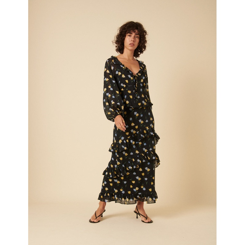 Say hello to Blanca. This classic black style with pretty florals is both light and airy. Were obsessed with the tiered hem with ruffles. Team yours with sandals for alfresco drinks. Flared hem Relaxed skirt that skims the body
