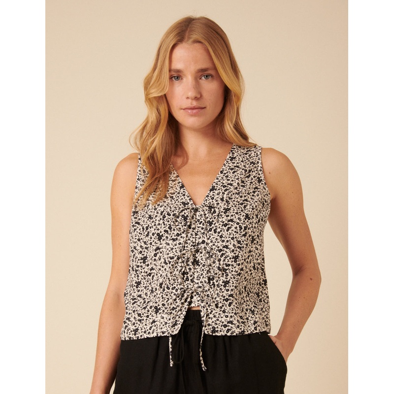 In black florals with trio tie details, this top is effortlessly romantic. Pair it with relaxed trousers for an easy, everyday look. V-neck String tie detail Designed for a relaxed fit Size tip: we recommend your usual size