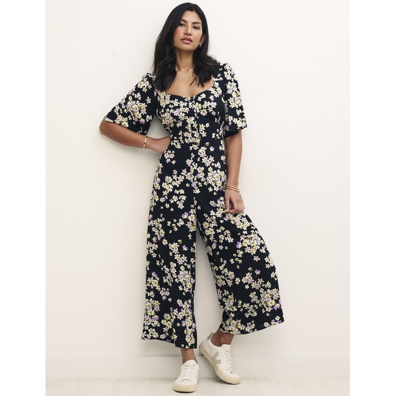 Another great jumpsuit. We just love her easy to wear fluted sleeves and cropped wide leg shape. Other details include the sweetheart neckline, flattering waist band and tie up back, designed to knot softly in a bow. Style yours with trainers.