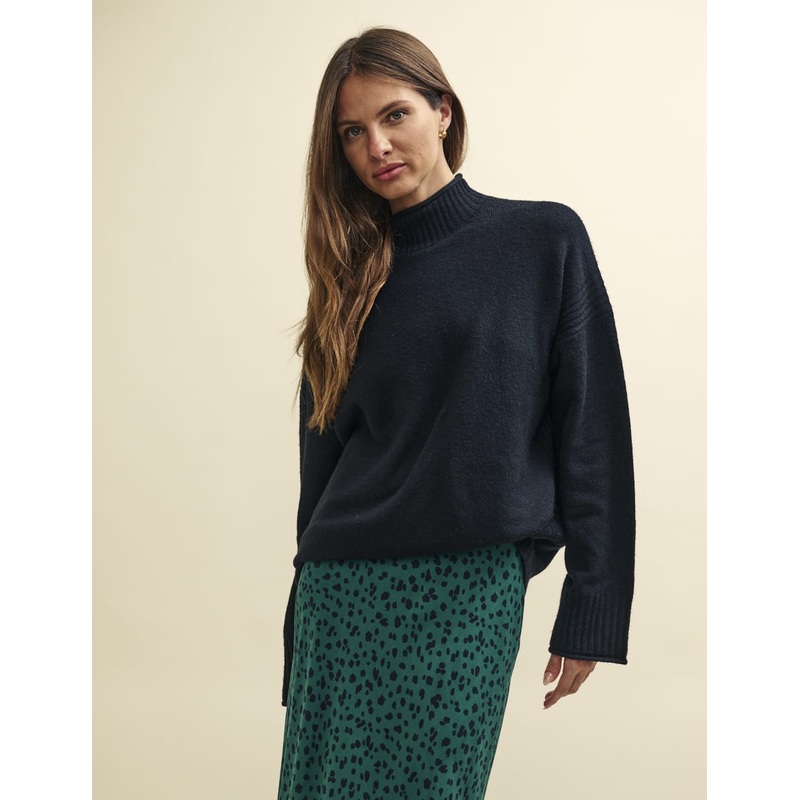 A black jumper is a true wardrobe hero. Slightly oversized but stylish in equal measure this funnel neck knit is soft and effortlessly easy to wear. Style yours with everything.