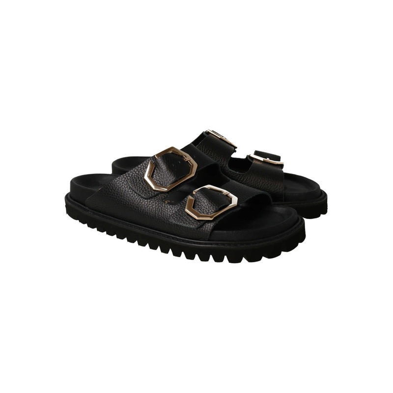 Chunky and effortless. These black slip-on sandals from Genuins feature double straps with oversized buckle detail. Theyll go with everything especially floaty dresses. By Genuins Slip-on style Adjustable buckle straps