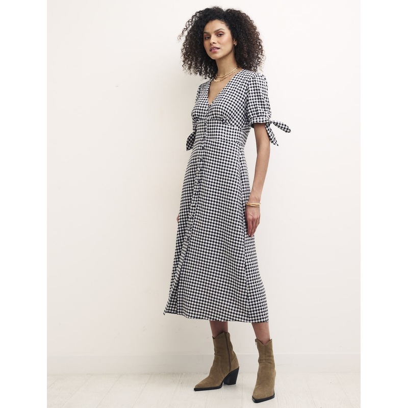 Slip into this black and white gingham tea dress. Alexis comes in sunshine-ready seersucker with pretty bow ties on the sleeves. Weve also added a subtle shirred back. Style yours with suede boots for catching up with friends. V-neck Short sleeve Fabric co