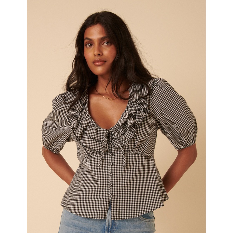 One for the gingham girls. Coming in the classic black and white print, this top features a flattering v-neckline, a relaxed silhouette, and delicate frill details. We love the button front too. Style with your favourite NC jeans. V-neck Short puff sleeves