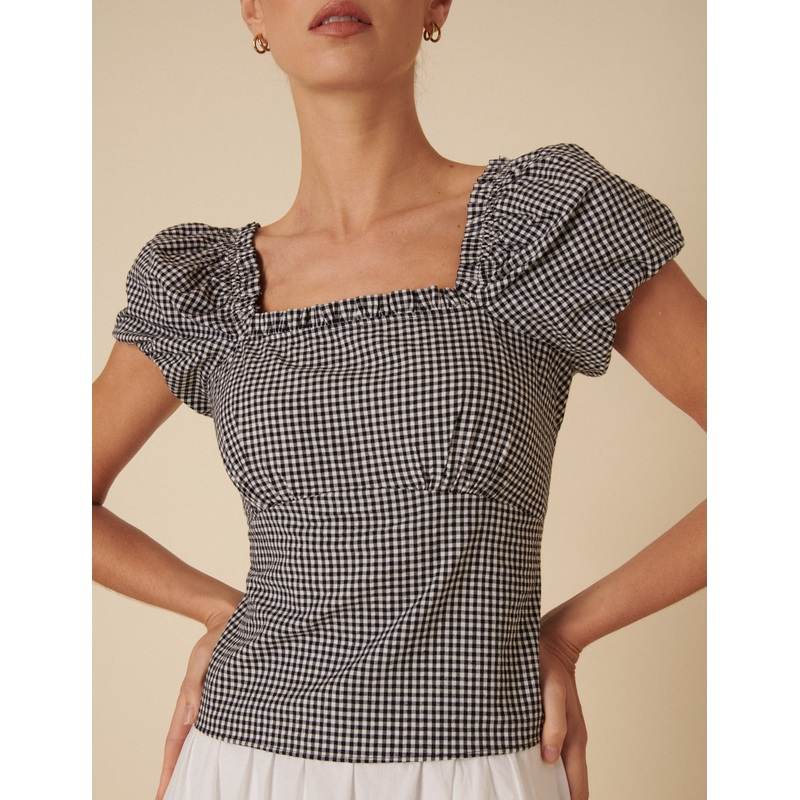 Check it out. Coming in a classic black and white gingham, our Ramona top is designed with a romantic square neckline and short puff sleeves. Wear with denim or a statement white skirt. Square neck Short puff sleeves Fitted bodice that defines the waist Si