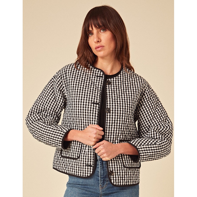 Outfit check. This on trend gingham quilted jacket is the perfect transitional piece. We love the black trims and statement patch pockets that you can fill with your everyday essentials. Wear yours with a classic white tee and denim jeans.