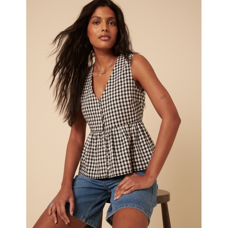 The perfect blouse. Coming in black and white gingham with a swishy peplum hem, this top is the ultimate waist-definer. The row of buttons really add to the look. V-neck Button front Size tip: we recommend your usual size