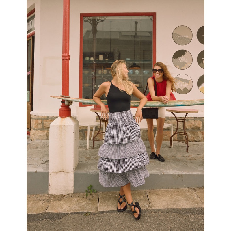 Check it out. Coming in classic black and white, our tiered skirt is all about playful print and movement. We love the flouncy layers featuring both a classic check and gingham. Style with our matching top or a casual white tee.
